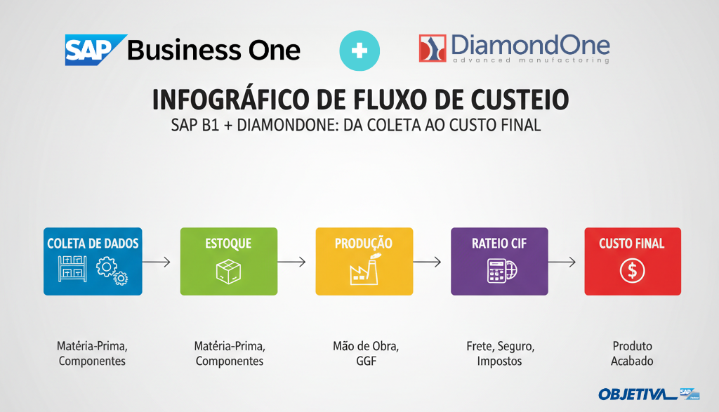 O maior desafio no custeio é a distribuição dos Custos Indiretos de Fabricação (CIF). O SAP Business One fornece a base, mas é com a solução especialista, como o DiamondOne, que o gestor alcança o domínio total. O DiamondOne, um Add-on certificado para SAP B1, eleva a automação para o método mais seguro e exigido pela legislação: o Custeio por Absorção perfeito.